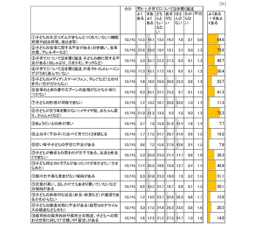 子育てに関して、①~⑱のような話をどの程度の頻度で聞くことがあるかをみると、「よくある」「まあよくある」を合わせた割合は、「②子どもの食事に関する不安がある(好き嫌い、食事の量、アレルギーなど)」が 75.9%で最も割合が高く、ついで「⑧子どもが言う事を聞かない(イヤイヤ期、赤ちゃん返り、かんしゃくなど)」が 72.3%、「①子どもの生活リズムがきちんとつくれていない(睡眠時間や起床時間、夜泣き等)」が 64.6%となっています。