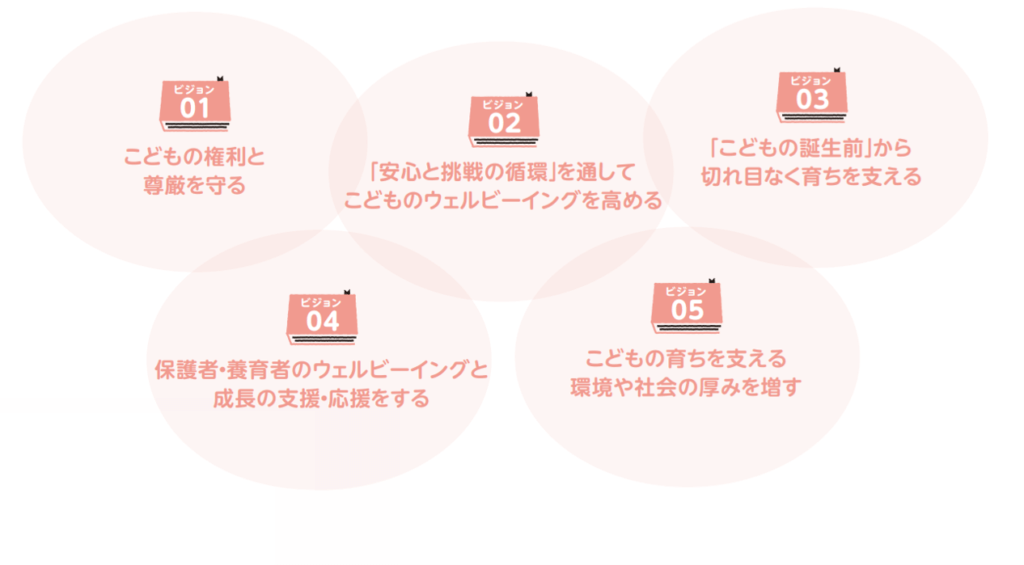 「はじめの100か月の育ちビジョン」は、妊娠期から小学校1年生の途中までの約100か月間を対象とし、こどもたちが安心して成長し、挑戦を楽しめる環境を整えることを目的とした政策です。このビジョンは、こどものウェルビーイング(身体的・精神的・社会的な幸福)を高めるために、次の5つの柱を中心に構成されています。