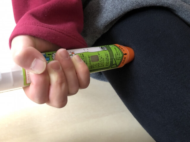 子どもの太ももの外側にエピペンを垂直に押し当てます。服の上からでも注射可能 - 注射する