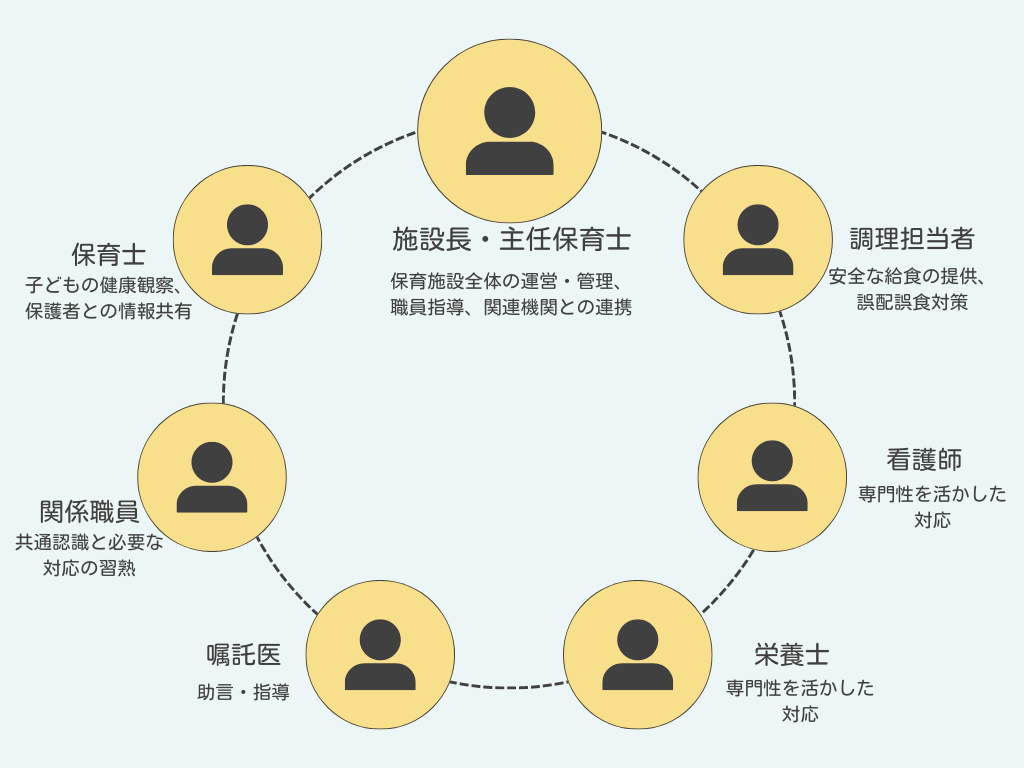 園内でアナフィラキシーが発生した場合に備えて、以下のような役割分担をあらかじめ決めておくとよいでしょう。