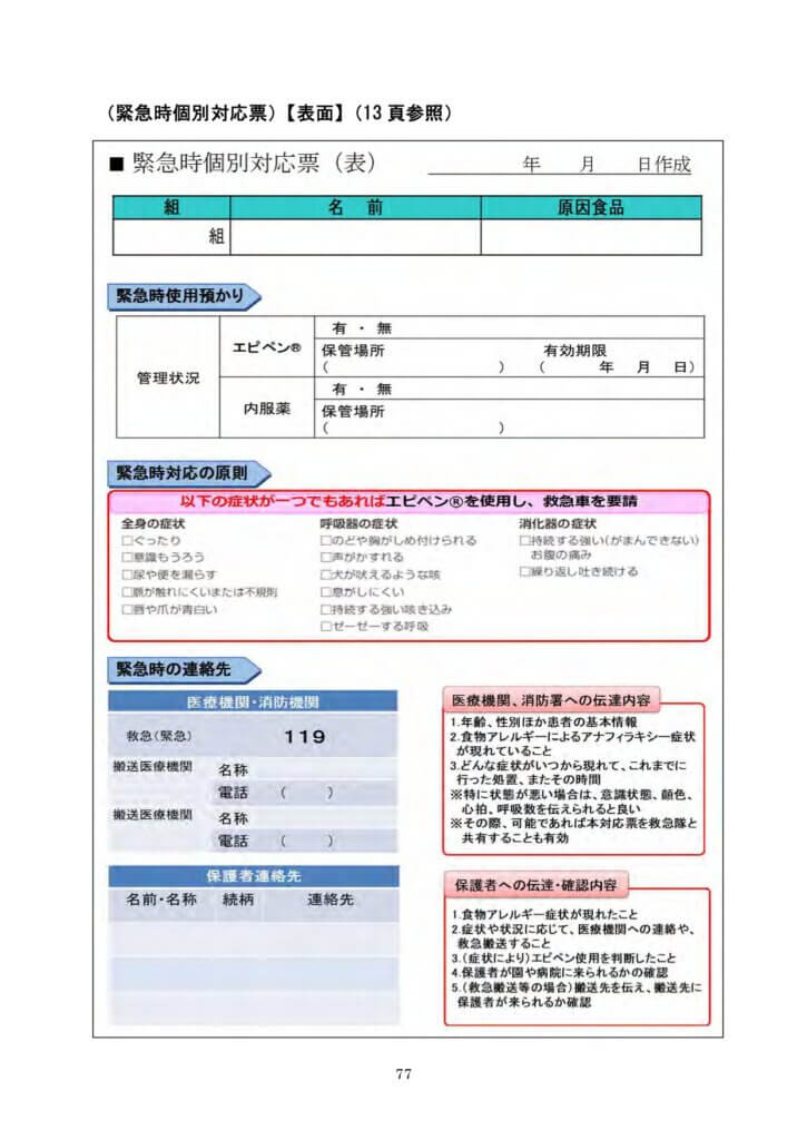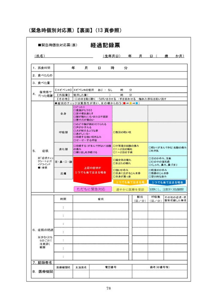 エピペンを預かる場合は、保護者と緊急時の対応について事前に協議し、「緊急時個別対応票」(PDF版)を作成します。緊急時個別対応票を作成することで、子どものアレルギー発作発生時に、どのように対応するかが明確になります。