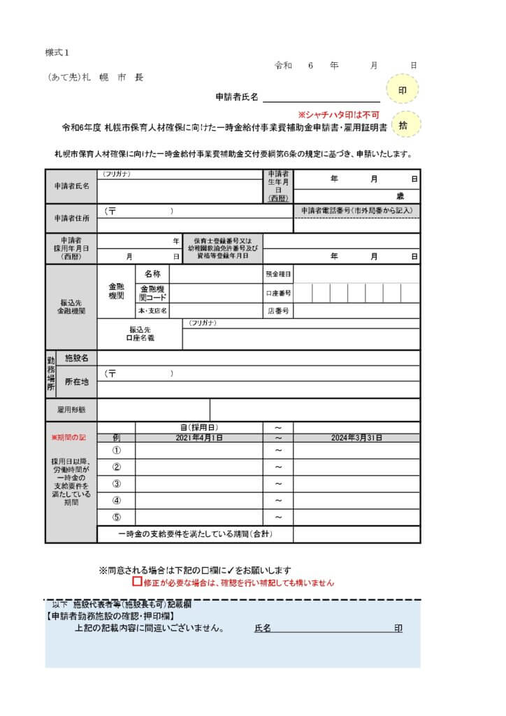 令和6年度札幌市保育人材確保に向けた一時金給付事業申請の案内(PDF:1,437KB)