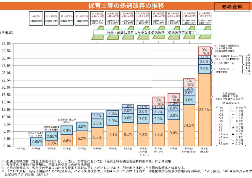 まずはこの図をみてください。近年、保育士の給与は処遇改善の取り組みを通じて上昇傾向にあります。例えば、処遇改善等加算Ⅰ~Ⅲをはじめ、国はこれまでさまざまな施策を講じてきました。