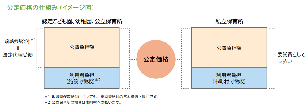 公定価格とは、保育に必要な費用の金額のことです。国が定めた基準に基づいて算定され、子ども一人あたりの単価として設定されています。公定価格は、設定区分(1~3号認定)、保育必要量、地域区分などによって異なり、施設の定員数や子どもの年齢によっても単価が異なります。