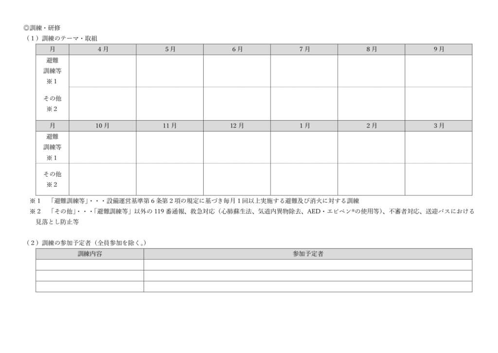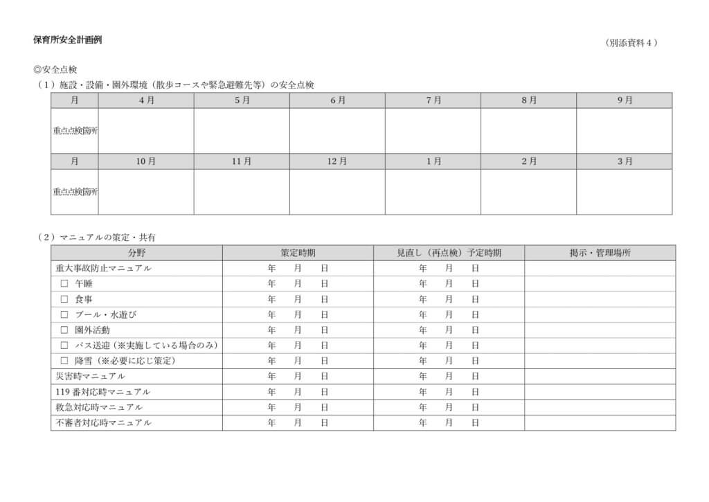 これは厚労省が例示した「保育所安全計画」のフォーマットです。(こども家庭庁HPより引用)安全点検、安全指導、保護者との共有、訓練・研修などのスケジュールがそれぞれの表でまとめられており、マニュアル策定・共有の一覧表もあり、園で大いに活用できるでしょう。