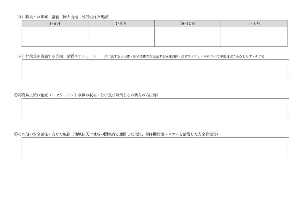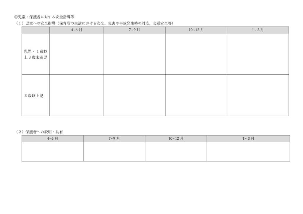 それでは早速、厚労省のフォーマットを参考に安全計画を策定しましょう。本記事ではそれぞれ年度始め、年度終わりの4月、3月の計画を紹介します。この計画を参考に、自園の環境に合わせてカスタマイズしてくださいね。